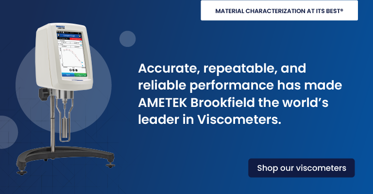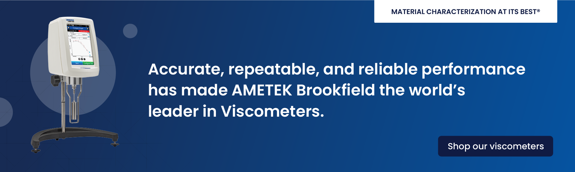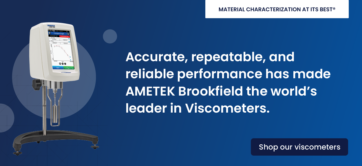 With a legacy dating back to 1934, AMETEK Brookfield is synonymous with viscosity as the pioneer of the viscosity measurement instrument that set the global standard still recognized today. Since then, we have been at the forefront of innovative solutions to offer an extensive range of scientific lab instrumentation including, viscometers, rheometers, powder flow testers, texture analyzers, Computrac® moisture analysis instruments, and Jerome® toxic gas analyzers that consistently meet regulatory regulations and customer application needs.